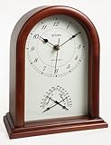 Features: Easy-to-read analog dials. Clock sets to the U.S. atomic clock. Cutting edge time technology in a traditional clock case. Made of solid wood and wood veneer with a superior finish. Automatically adjusts for day light savings. Thermometer and hygrometer.